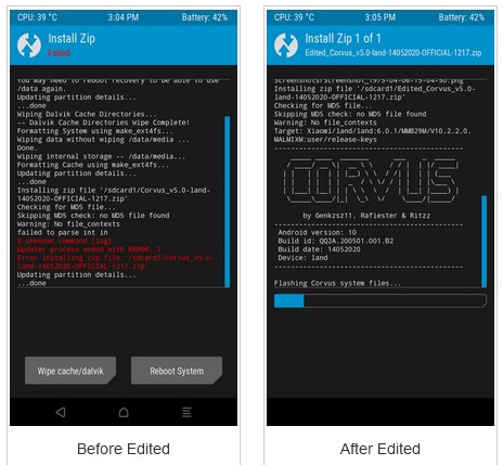 How to Fix TWRP Update Process Ended with Error: 7. It happened to me when flashing Corvus ROM. Error with status 7 is because the ROM updater script file checks whether your phone model is compatible with the ROM you installed. In the updater script, there is an “Assert” command where this mechanism allows you to be saved for errors installing the ROM. I suggest you to use 7-zip and Notepad++ to edit the custom ROM.